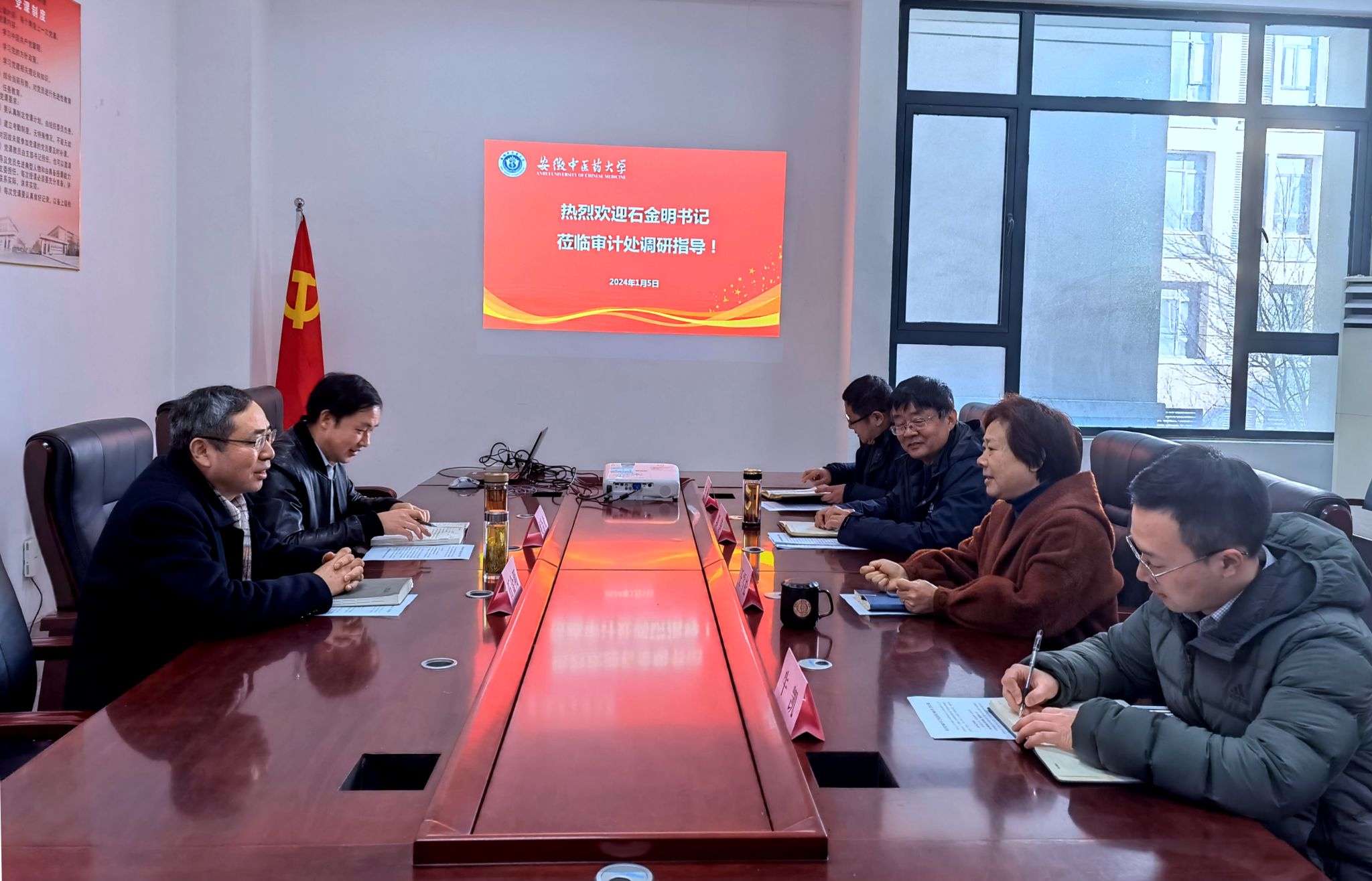 2024年1月5日上午,学校党委常委、纪委书记、省监委驻学校监察专员石金明深入审计处开展调研,学校纪委副书记、纪委办公室主任姚为久陪同调研。审计处处长王雪松、副处长郭铮及全体人员参加调研座谈。